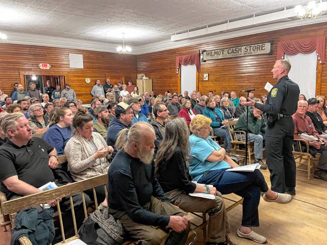 The Wilmot town meeting was supposed to start at 7:00 pm – at five past, residents were still lined up outside the historic town hall waiting to register. Inside, chatted centered on the high attendance and high taxes.
