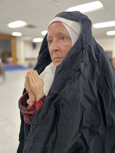 The show is set in a school auditorium, where the nuns have taken over a stage already set for an 8th grade production of Grease. This is fortuitous for Footlight: the recent shuttering of the Franklin Opera House has caused the community theatre group to seek out new stages and they landed, in this case, at the Franklin Middle School. Talk about an immersive production!