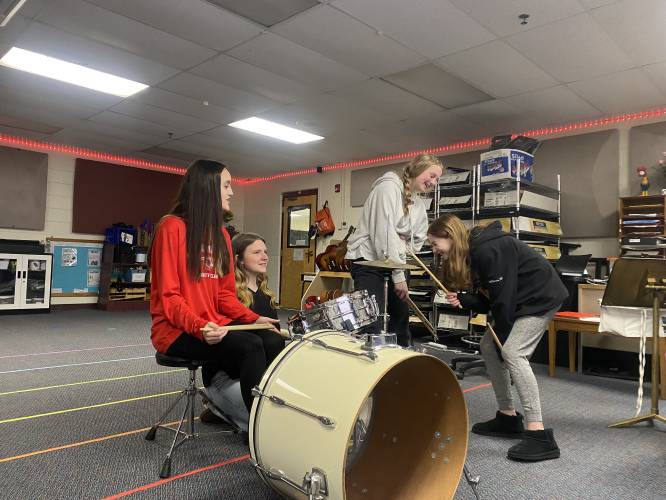 (From left) Ivy Restuccia, Lana Meany, Milly Wilson and Heidi WilsonThe joy of music! These seventh and eighth-grade students at the Henniker Community school in World Drumming class work together to learn to play the drum set.